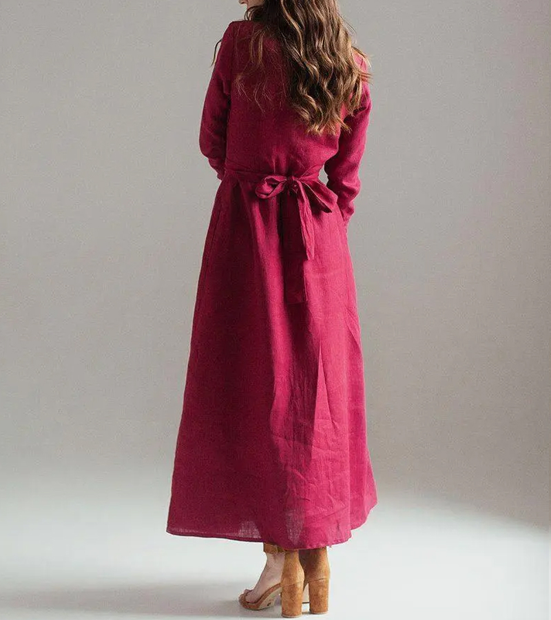 Burgundy Solid Color Linen Wrap Dress